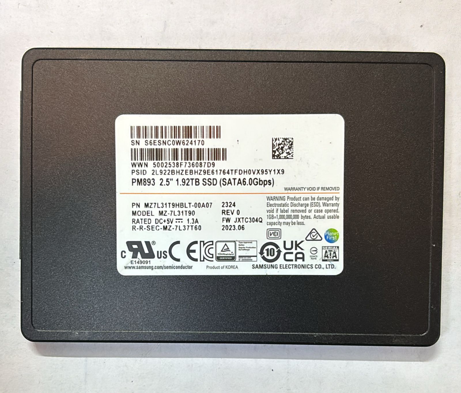 The Samsung PM893 1.92TB is a high-capacity 2.5″ SATA enterprise-grade SSD delivering up to 550 MB/s sequential read and 520 MB/s sequential write speeds with Samsung V-NAND TLC storage, advanced power-loss protection, AES-256 encryption, and robust reliability — ideal for data center, server, or high-demand storage applications.